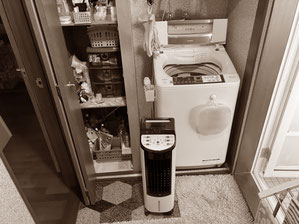 洗面脱衣室では、寒さ対策としてスタンド式ヒーターと電気ヒーターを2台使用していました。