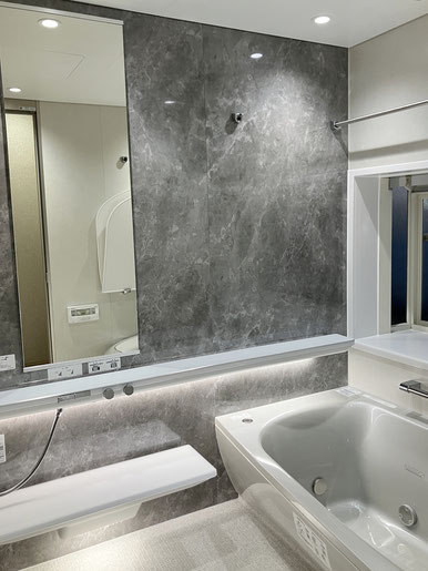 ホテルライクな雰囲気をイメージした浴室は、アクセントパネルに石目柄の「ピアクレアソフトグレー」を採用。ダウンライトに照らせることで、石目の重厚感がより一層際立ちます。